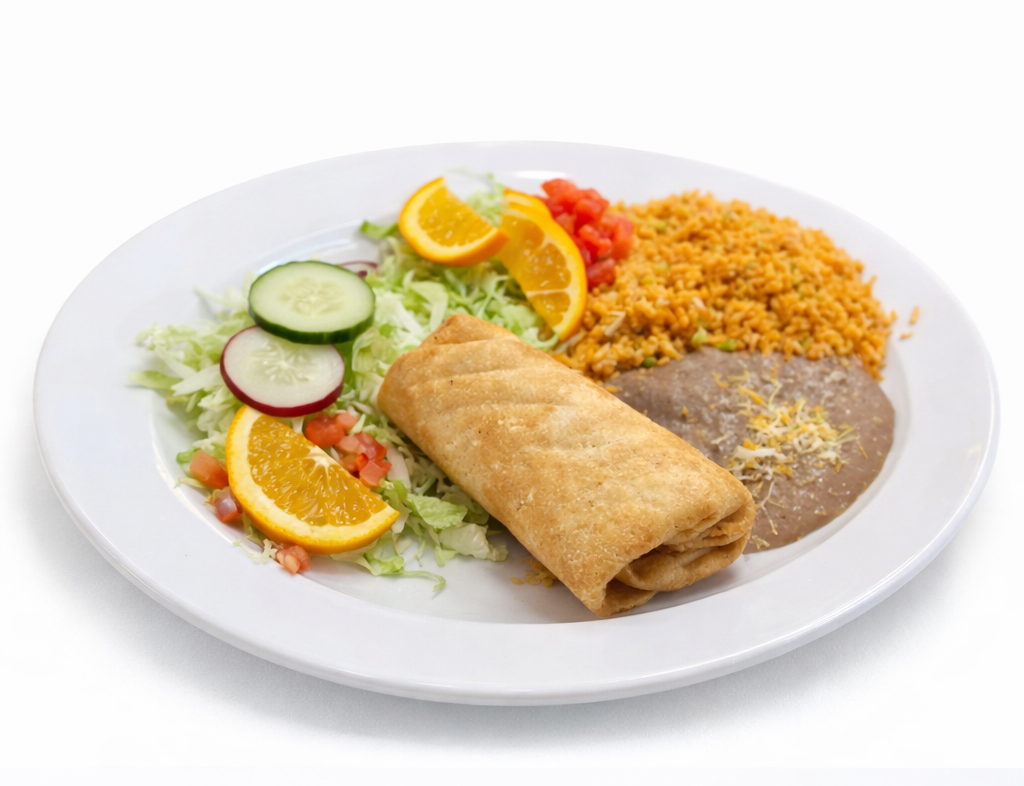 Deep-fried tortilla filled with steak and cheese. Served with rice, beans, and sour cream.