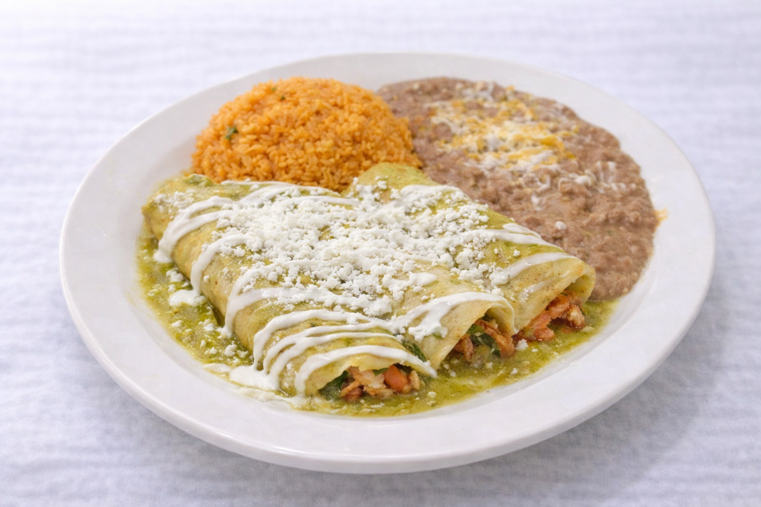 Three enchiladas with choice of meat, served with rice, beans, salad, and sour cream. Choose green or red sauce.