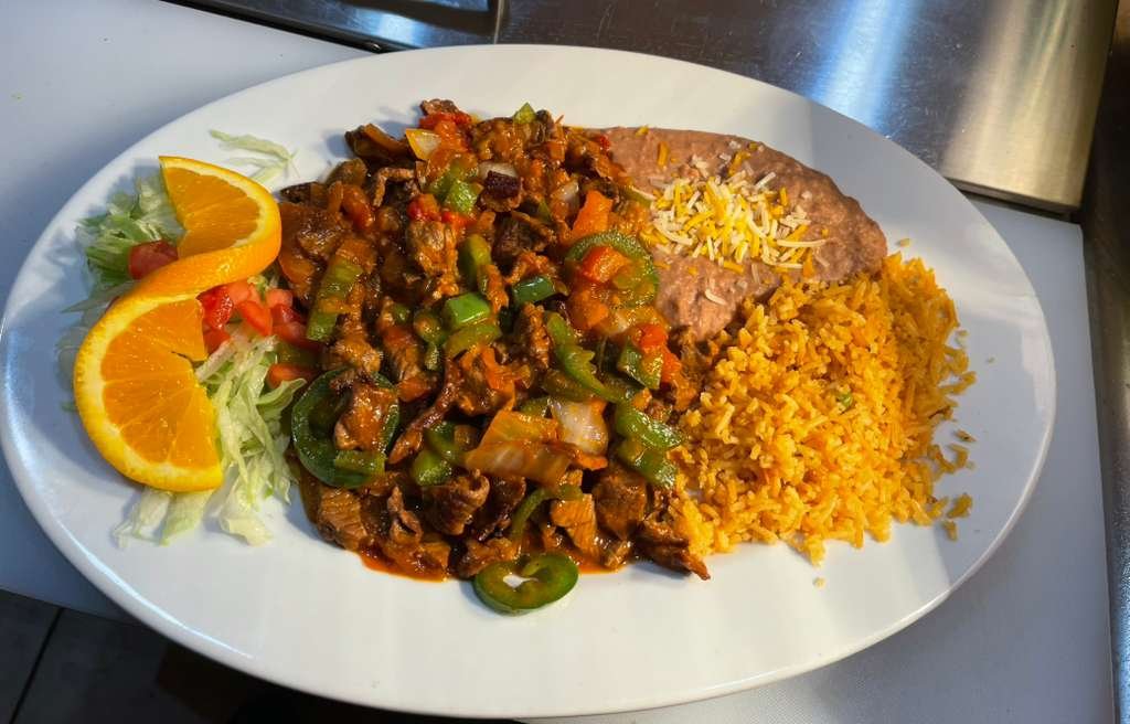 Flavorful Mexican-style steak sautéed with onions, tomatoes, and fresh green peppers, served with Mexican rice, refried beans topped with cheese.