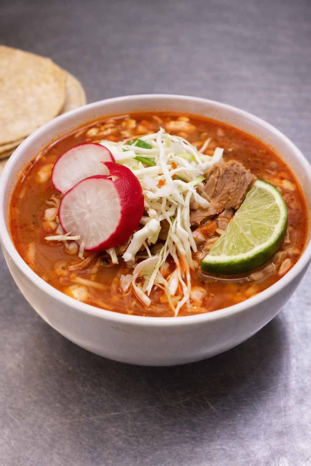 Traditional Mexican soup with pork and hominy in red chile broth. Served with lime, onions, cilantro, and tortillas.