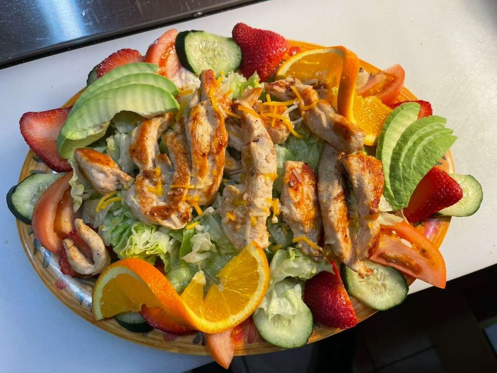 Our Grilled Chicken Salad / Grilled Steak is a fresh and flavorful option made with juicy grilled chicken breast served over a crisp bed of lettuce. Topped with avocado slices, fresh tomato, cucumber, strawberries, shredded cheese, and orange slices, this salad offers the perfect balance of savory and refreshing flavors.