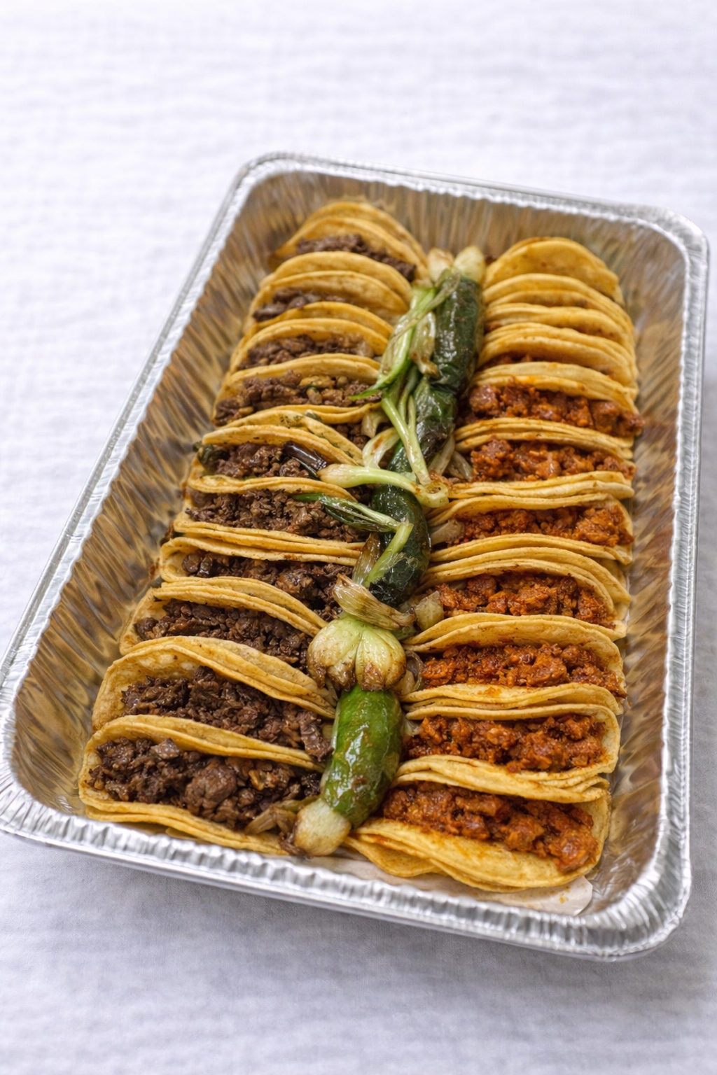 Tray of 20 or 30 tacos (steak, chicken, beef, al pastor, carnitas). Limited options.